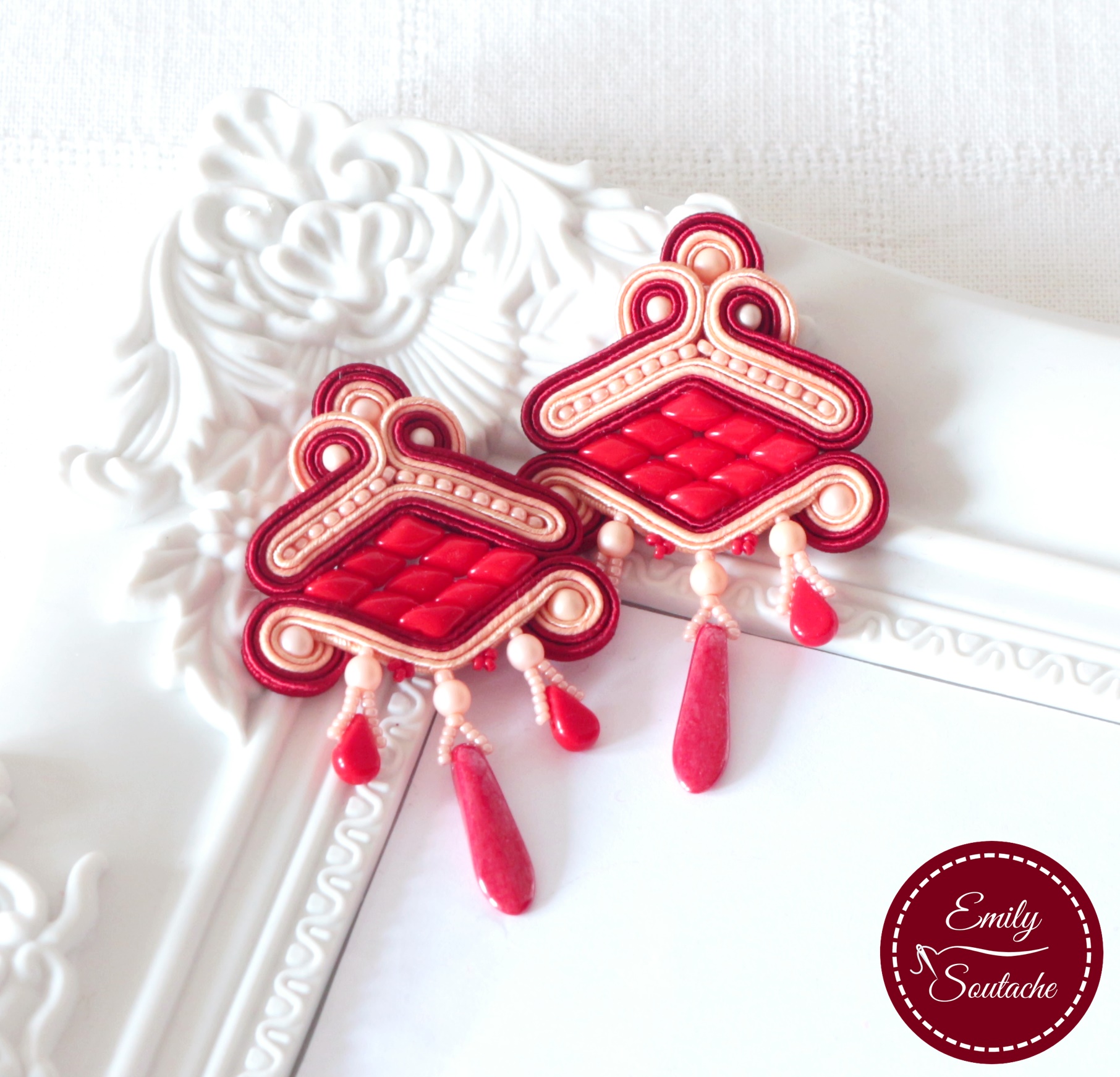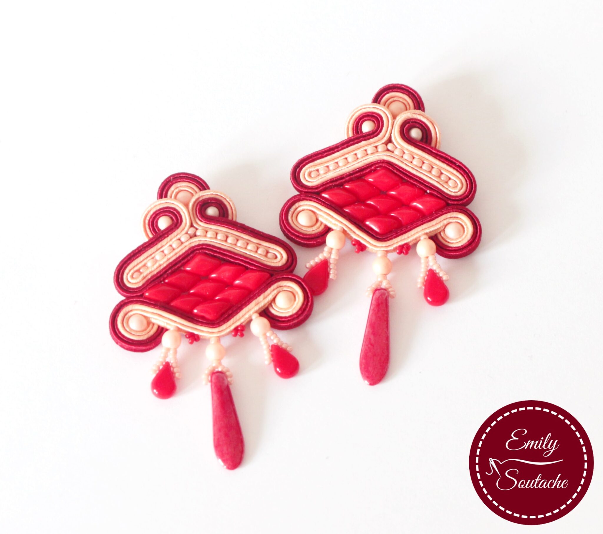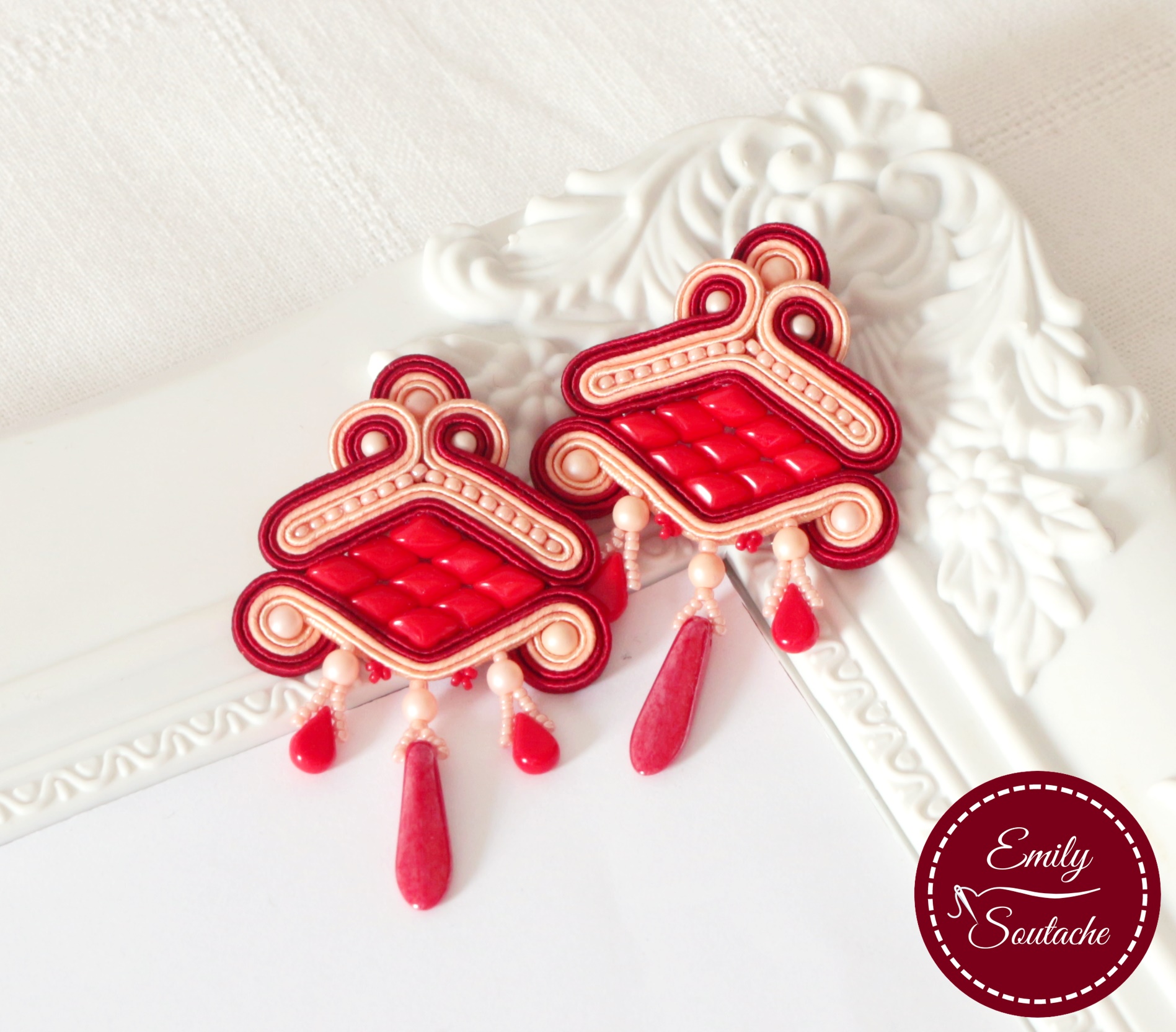 Most egy nagyon különleges formájú ékszert készítettem piros-barack színösszeállításban, a tőlem már megszokott csoda szép porcelán lencsék felhasználásával.