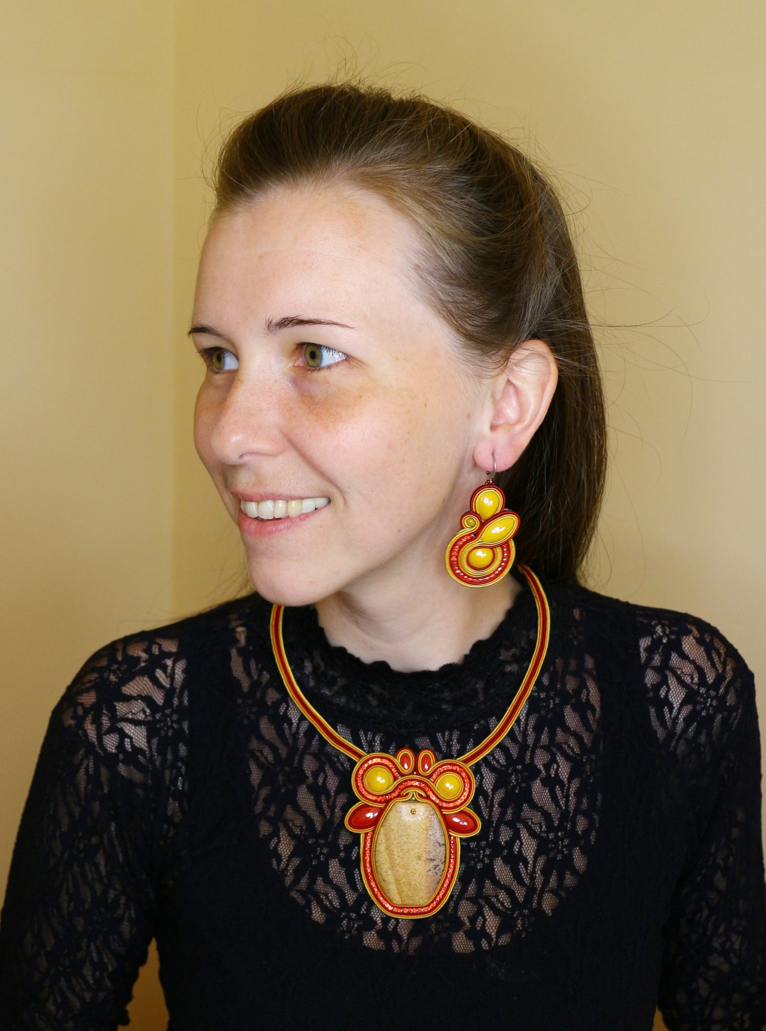 Ez az impozáns, egyben klasszikusan elegáns medálos nyaklánc egy nagyobb méretű jáspis ásványt rejt középen, amit strasszlánccal és sok szép porcelán lencsével varrtam körbe. A medál hátát barna műbőrrel fedtem be. A medál aprólékos végig varrt sujtás pánthoz csatlakozik, melyek jáspis ásványgyöngyökben végződnek. A nyaklánc 3 állásos: 41-42-43 cm. A nyaklánchoz rögzített medál hossza: 8.5 cm, szélessége 7 cm.